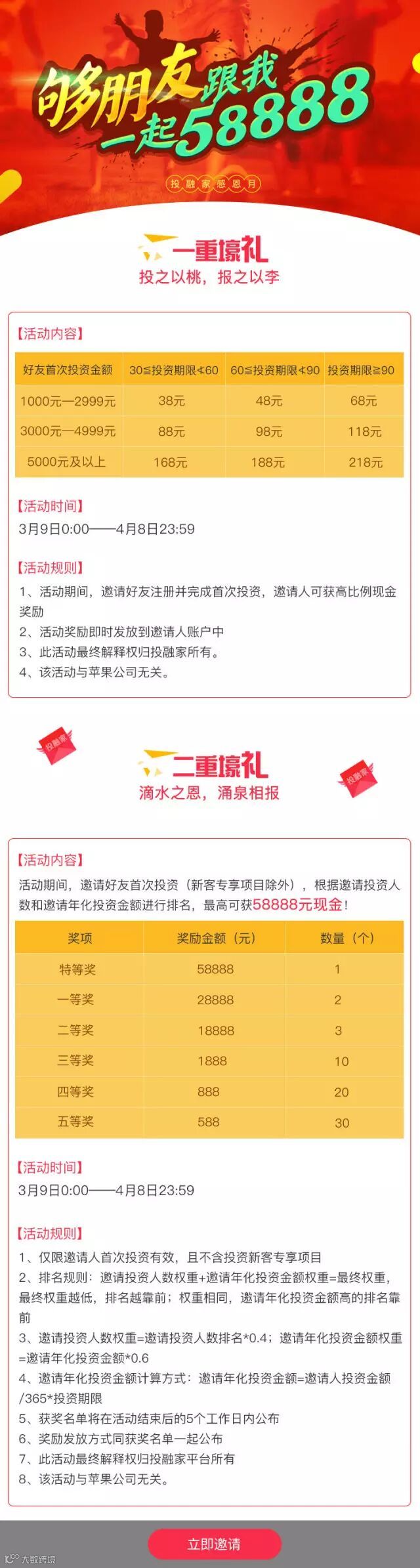 活动期间,邀请好友首次投资(新客专享项目除外),根据邀请投资人数和邀请年化投资金额进行排名,最高可获58888元现金!