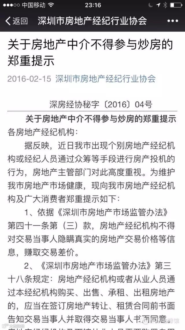 而就在2月15日,深圳市房地产经纪行业协会发布《关于房地产中介不得参与炒房的郑重提示》的通知,文中称: