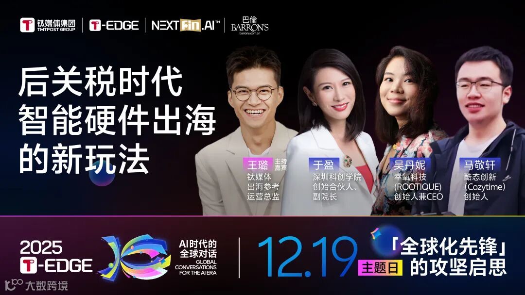 12月19日,钛媒体2025T-EDGE全球对话特设“后关税时代,智能硬件出海下一站在哪”圆桌论坛,钛媒体出海参考运营总监王璐与深圳科创学院创始合伙人兼副院长于盈、头皮健康硬件品牌幸氧科技(Rootique)创始人兼CEO吴丹妮、智能家电品牌酷态创新(Cozytime)创始人马敬轩一起探讨当下变化的出海环境及其智能硬件创业出海的卡点与技术跨越。