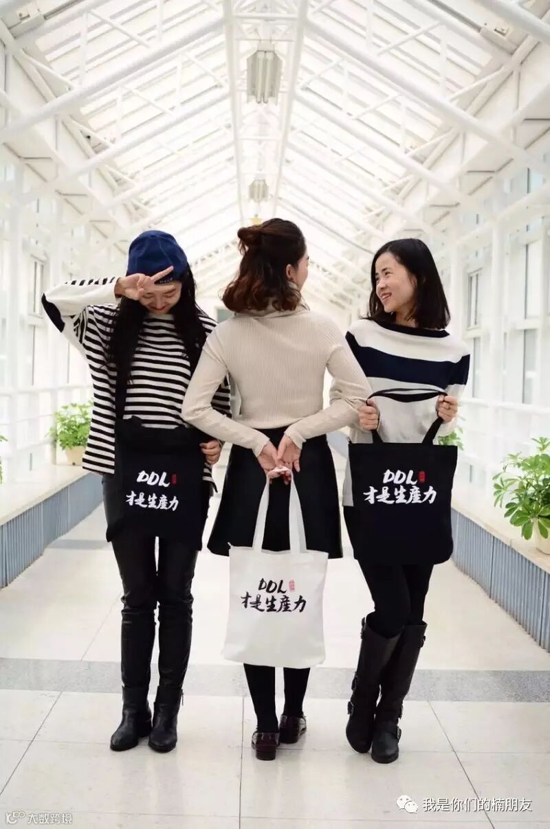 这件小事也奠定了我后来继续“楠朋友”品牌的基础,后来在光华上课的时候,发现自己之前的小包转不了书和电脑,又不想背双肩包,就自己用书法写了一些字,印在帆布包上,这是”楠朋友”品牌的第4个产品,帆布包系列。
