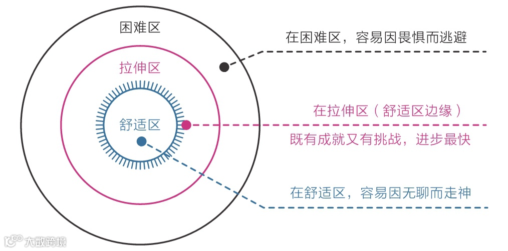 《认知觉醒》大致内容我也快忘得一干二净,但是有一张图深深地刻在了我心里,这里有一个概念——拉伸区,它是既有成就又有挑战,是进步最快的区域。愿大家都能不断找到属于自己的拉伸区,然后去突破和坚持,成为更优秀的自己。