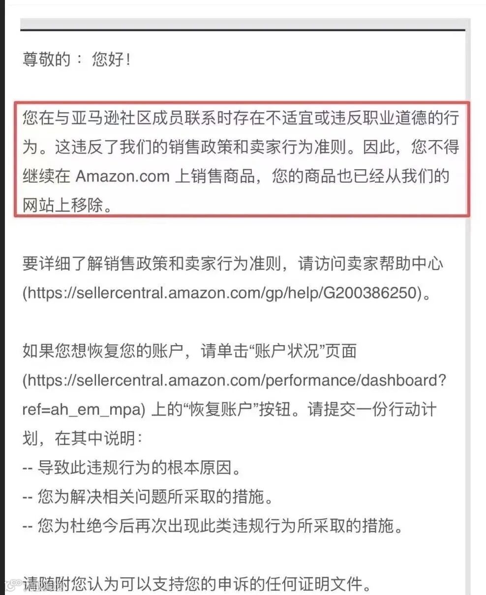 近日,一封亚马逊官方发送的封店邮件截图在卖家圈内流传。邮件直指该卖家在与亚马逊社区成员交流中行为失当,违反了销售政策和卖家行为准则。