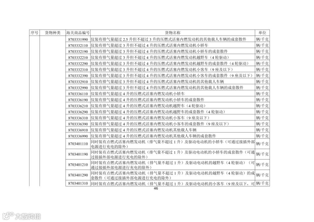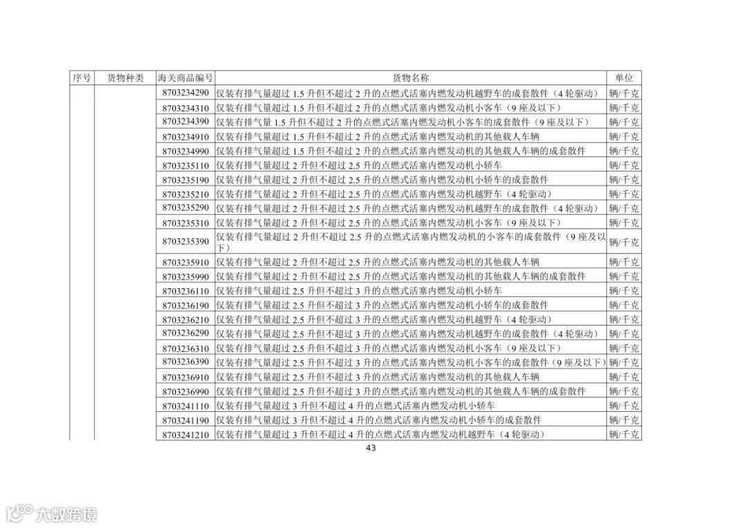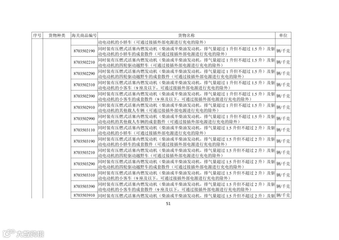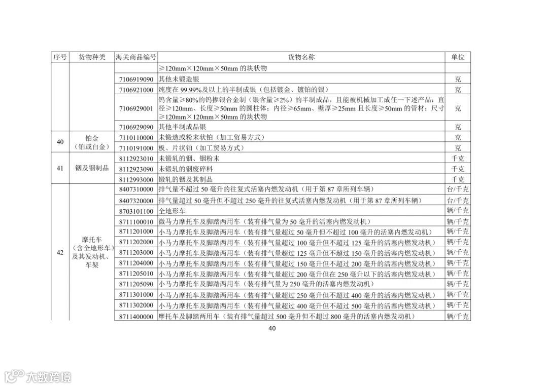 (五)出口活牛(对港澳以外市场)、活猪(对港澳以外市场)、活鸡(对香港以外市场)、牛肉、猪肉、鸡肉、天然砂(含标准砂)、矾土、磷矿石、镁砂、滑石块(粉)、萤石(氟石)、稀土、锡及锡制品、钨及钨制品、钼及钼制品、锑及锑制品、焦炭、成品油(润滑油、润滑脂、润滑油基础油)、石蜡、部分金属及制品、硫酸二钠、碳化硅、消耗臭氧层物质、柠檬酸、白银、铂金(以加工贸易方式出口)、铟及铟制品、摩托车(含全地形车)及其发动机和车架、汽车(包括成套散件)及其底盘的,需按规定申领出口许可证。其中,消耗臭氧层物质的货样、广告物品、捐赠、退运、残液需凭出口许可证出口;以一般贸易、加工贸易、边境贸易和捐赠贸易方式出口汽车、摩托车产品的,需按规定的条件申领出口许可证;以工程承包方式出口汽车、摩托车产品的,凭对外承包工程项目备案回执或特定项目立项回执等材料申领出口许可证;以上述贸易方式出口非原产于中国的汽车(限新车)、摩托车产品的,凭进口海关单据和货物出口合同申领出口许可证。