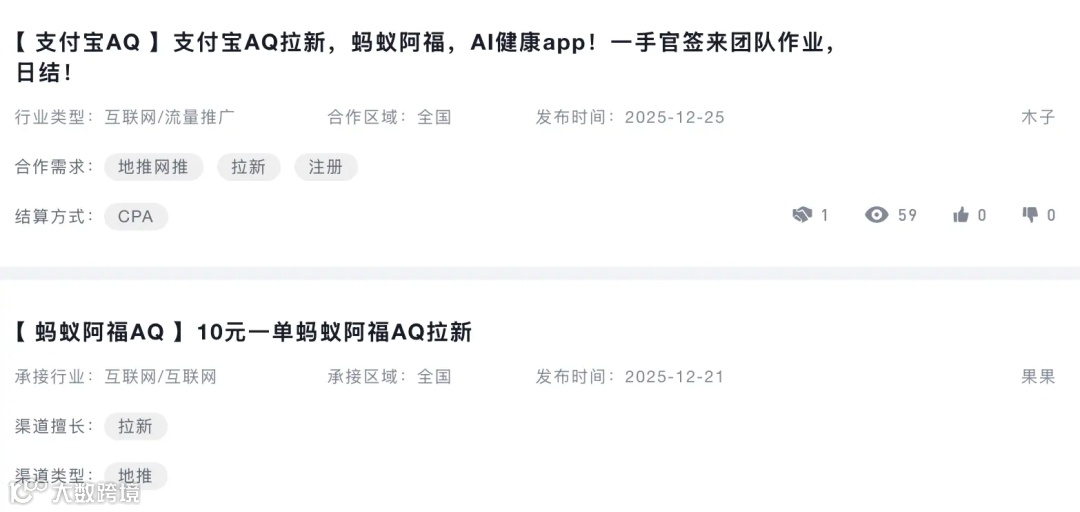 地推动作集中于更名后。接单平台数据显示,AQ时代仅有零星任务,首批阿福推广单始于12月11日,即更名前两日。