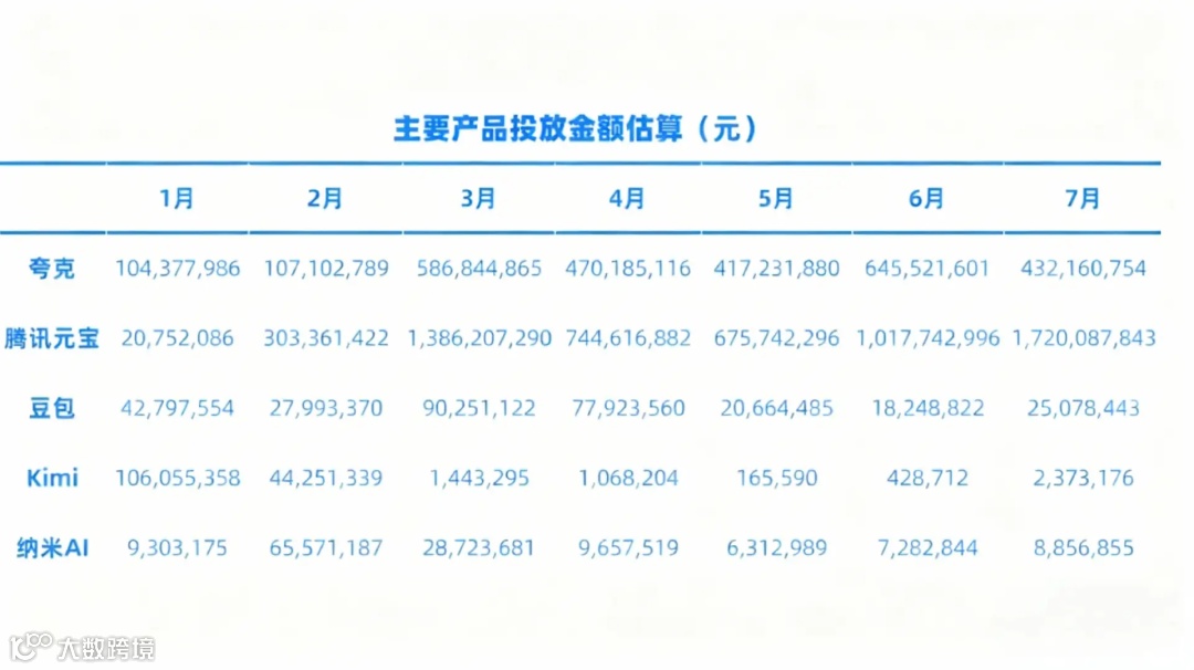 但线上买量竞争异常激烈。AppGrowing数据显示,元宝自2025年2月起投放金额持续攀升,截至7月累计达近60亿元;而曾高调投放的Kimi,已从年初单月过亿迅速回落至十万级量级。