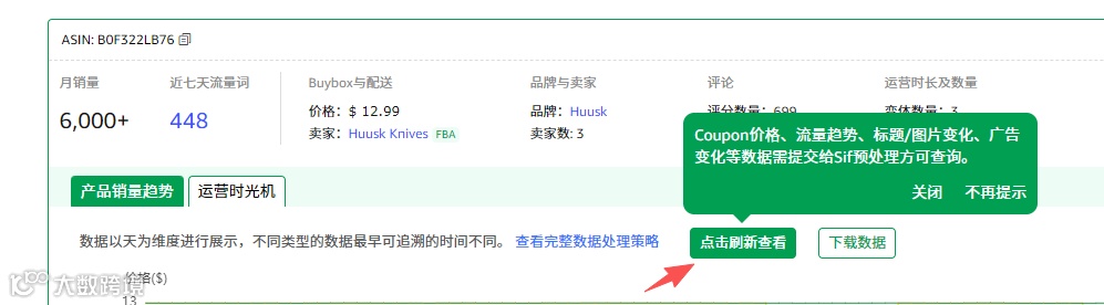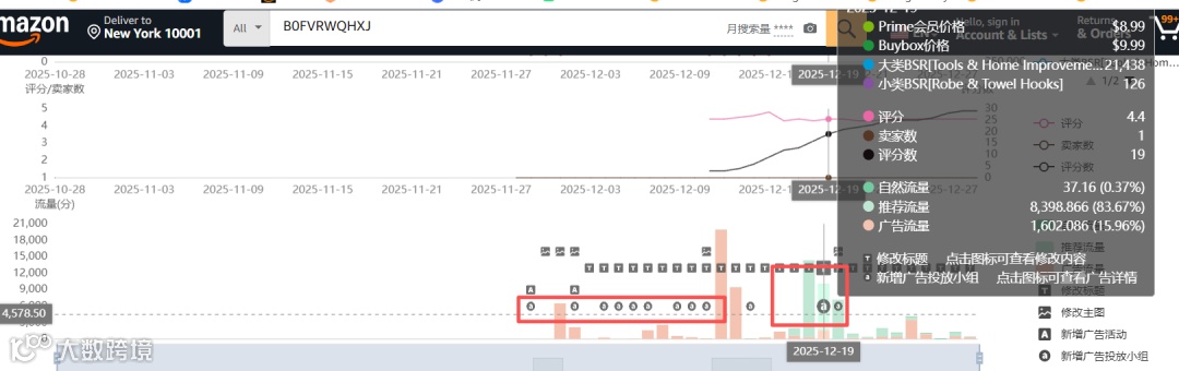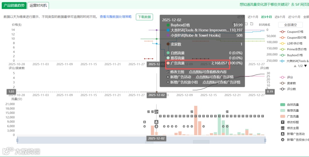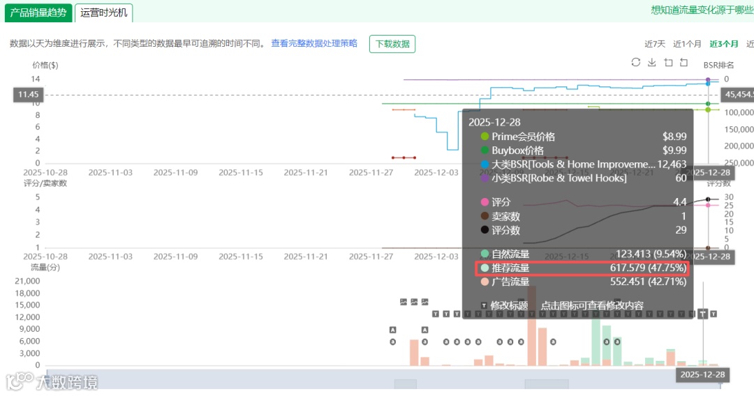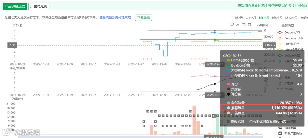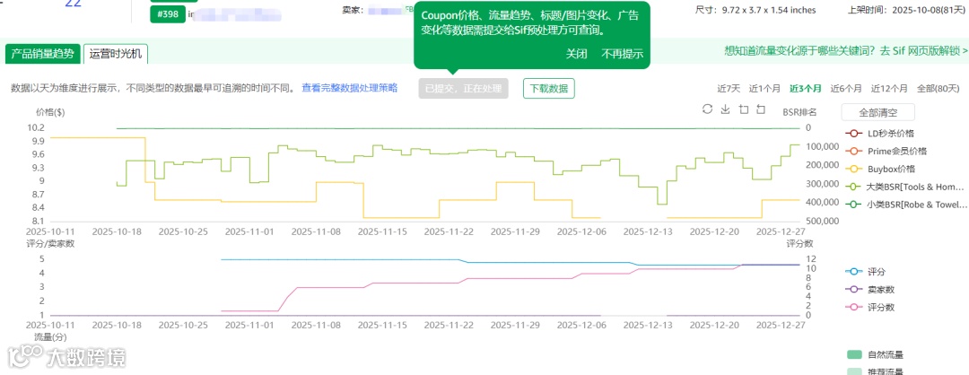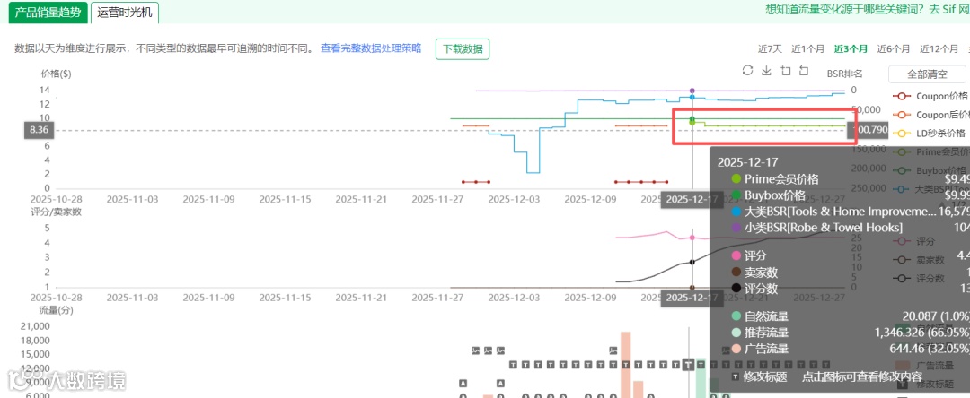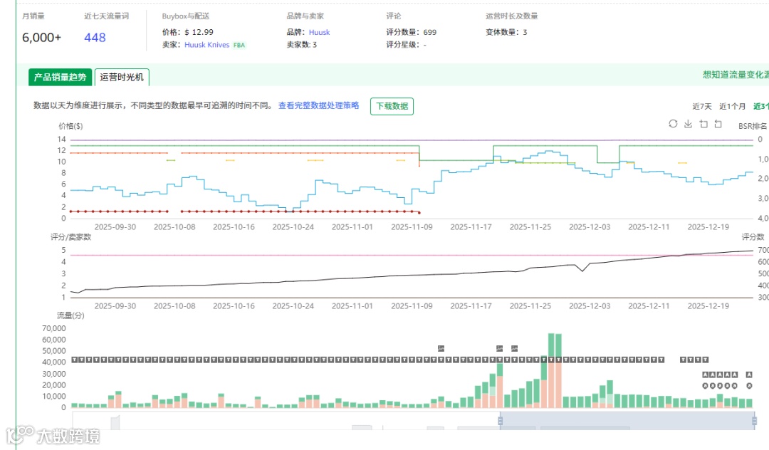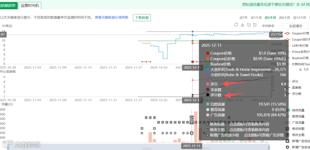 在观察价格变化趋势的同时,我们还要关注评价和评分数的变化趋势。可以看到在12月11日这一天上了3个评价,评分数为4.4分。