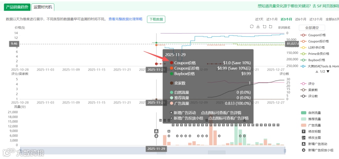 我们可以看到这个产品是从10月28日上架的。11月28日正式开售,11月29日做了10%的COUPON , Coupon只做了3天就取消了。从11月29日到12月1日。 然后从12月11日到12月15日, 又做了6天的COUPON .