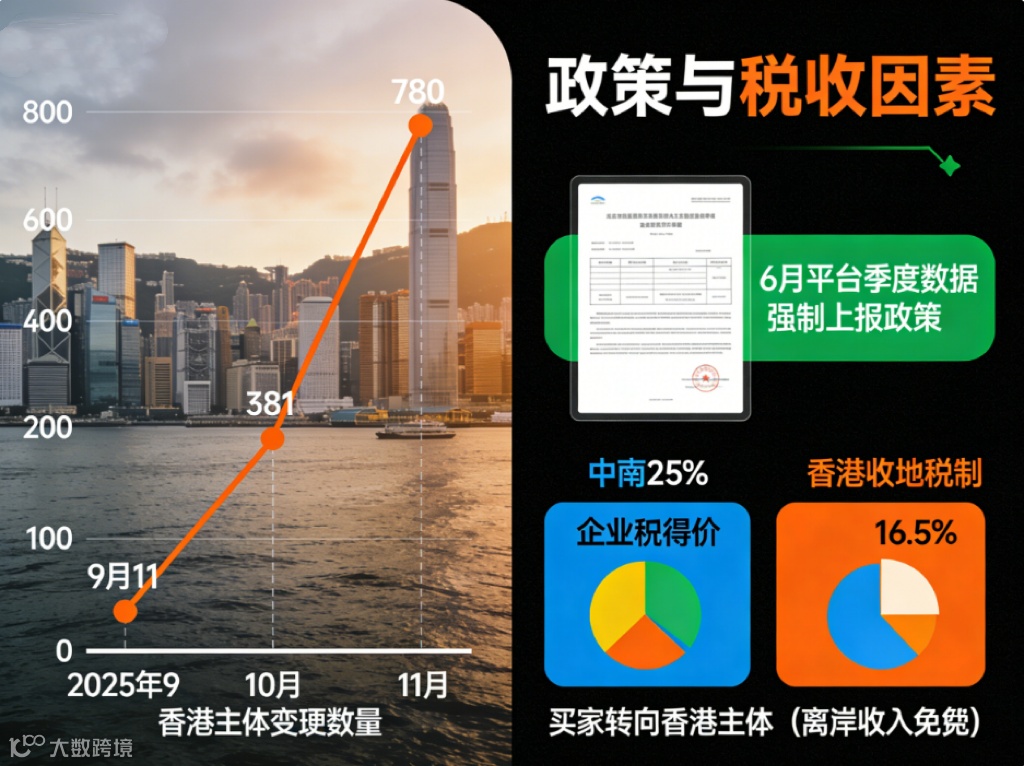 2025年,亚马逊店铺香港主体变更数量激增,9月达到11起,10月升到381起,11月更是飙到780起。这一迁移潮与2025年6月落地的平台季度数据强制上报政策时间点高度重合。