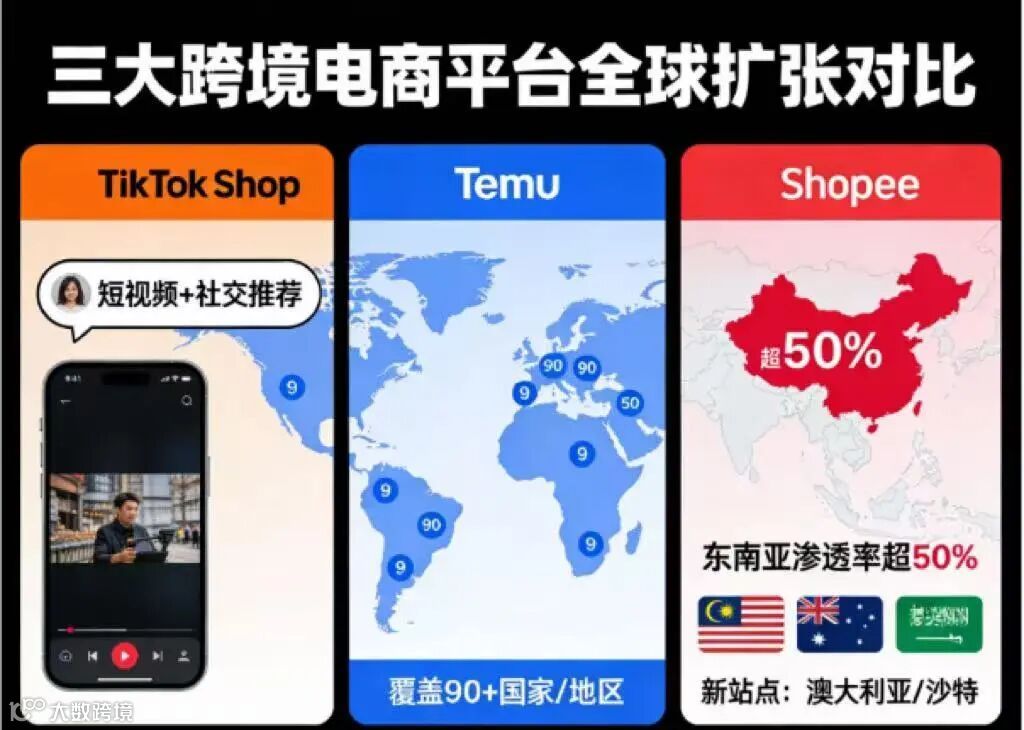 与此同时,其他跨境电商平台也在积极布局新市场。拼多多跨境电商平台Temu在2025年的运营已覆盖90多个国家和地区,并通过本地卖家计划在英国、法国、意大利、墨西哥等地增强市场渗透力。Shopee在东南亚市场的渗透率超50%,并新增澳大利亚、沙特站点,支持多语种直播带货。