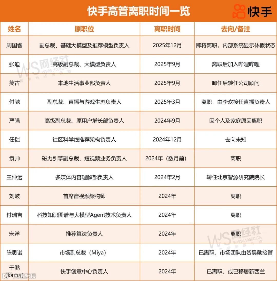 这场高管离职潮覆盖了推荐算法、多模态、商业化等多个核心领域,引发市场对快手技术战略连续性的担忧。
