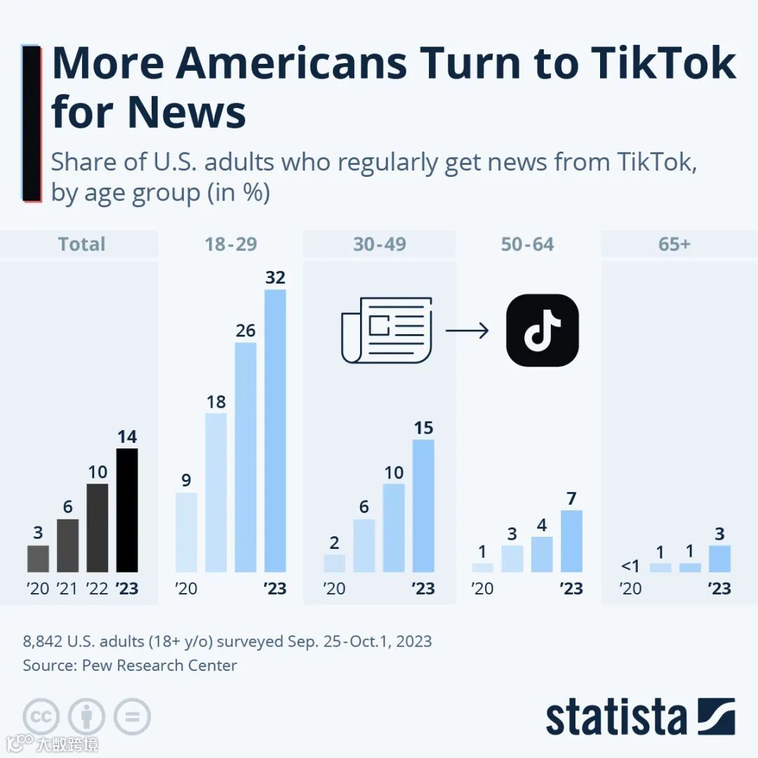 当然,这种变化并不意味着风险消失。皮尤研究中心在报告中也提醒,TikTok 在新闻传播上的优势,恰恰与其挑战并存。内容传播速度快、扩散范围广,使虚假或误导性信息一旦被算法放大,影响面会成倍扩大。同时,新闻内容高度依赖个性化推荐,可能导致用户长期处在“信息回音室”中,对世界形成片面认知。从信任层面看,尽管 TikTok 在年轻人中的使用率极高,但在年长群体中,传统新闻机构依然拥有更稳固的公信力基础。