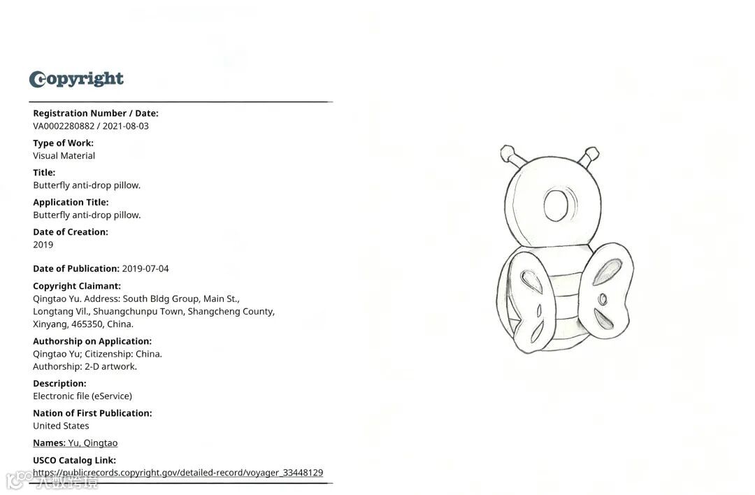 原告为国人卖家Qingtao Yu,其名下有一款名为Butterfly anti-drop pillow的蝴蝶防摔枕。该产品用于爬行和散步,专为在爬行、站立和走路的早期阶段保护宝宝的头部而设计。这是一款理想的婴儿安全装备,防止头部碰撞和摔倒室内或室外