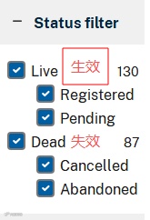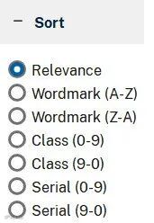 5、在左侧筛选栏中,我们可进一步筛选目标商标。仅勾选“Live”或“Dead”,即可筛选出处于生效或失效状态的商标。在“Sort”一栏中,可将搜索结果按照商标名称首字母、类目或号码进行排序。