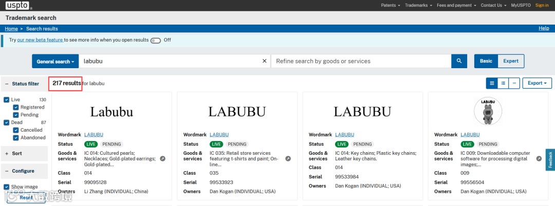 3、通过检索,我们发现包含labubu相关的商标超过200个,但其中未必都是我们需要的目标商标。此时,我们可以通过细化检索条件来进一步筛选。