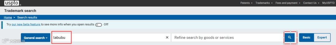 2、在输入框输入自己想查询的商标名字,这里我们以“labubu”为例输入,再点击放大镜图标进行检索。