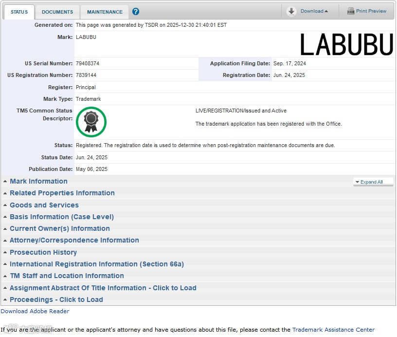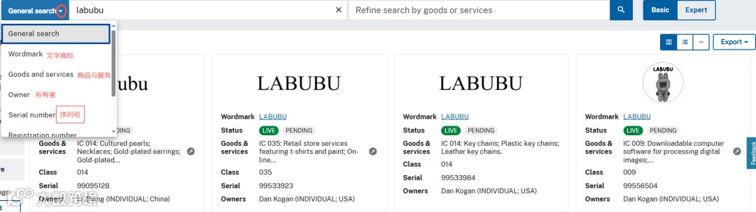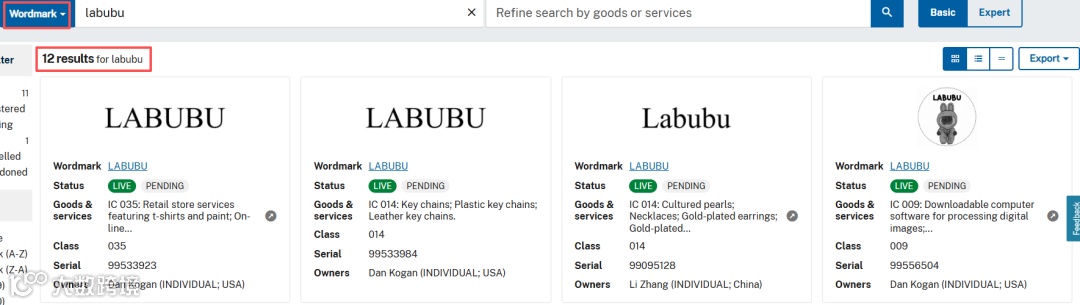 4、在“General search”下拉菜单中,可查看用于搜索的以下条件。点击“Wordmark”后,即可看到文字商标为“labubu”的商标,共计12个。