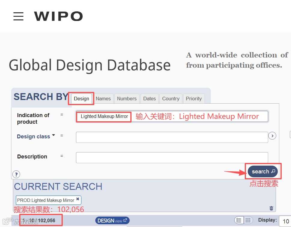 3、在Design下面的Indication of product 框里输入关键词, 然后点击Search。