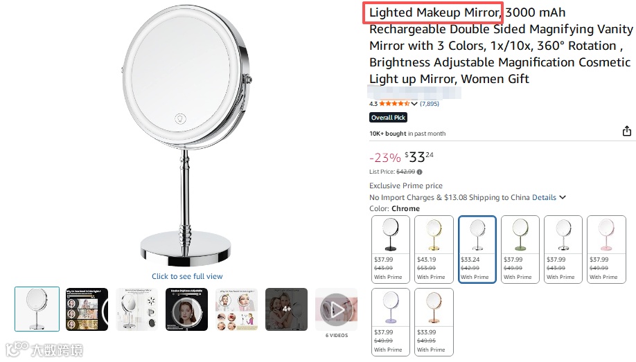 比如这个化妆镜,我们可以先从亚马逊标题或者用软件提取其主要关键词,关键词:Lighted Makeup Mirror。