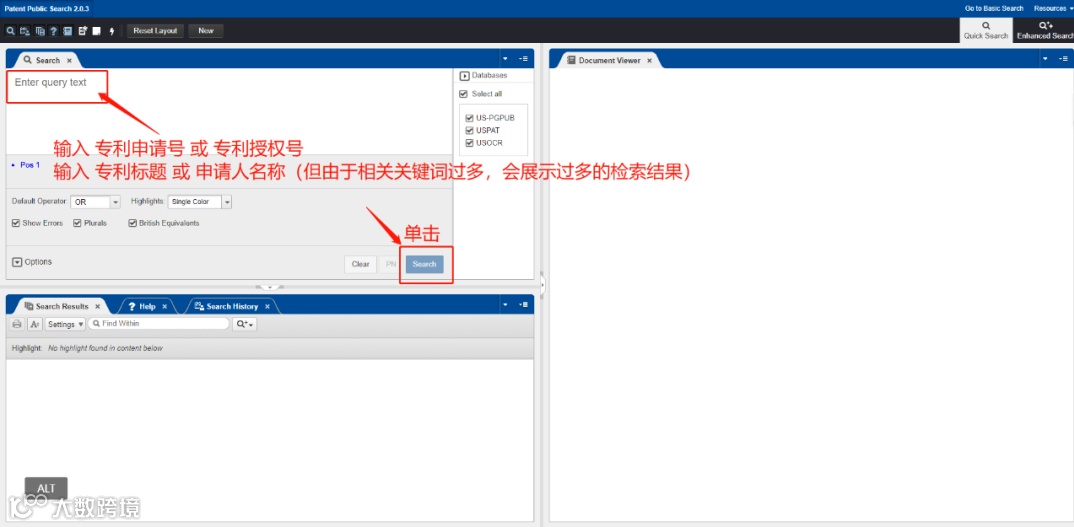 3、输入专利申请号或专利授权号,点击Search即可查询,还可以输入专利标题(关键词)或申请人名称,但由于相关关键词过多,会展示过多的检索结果。
