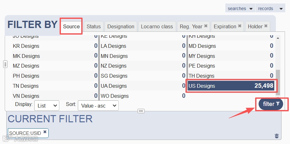 4、在检索结果页面左侧“Source”区域,勾选“US Designs”(美国外观设计专利),点击“Filter”应用筛选条件。
