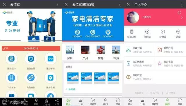 爱洁家全面采用新版基于微信平台的微营销系统,由微网站及服务商场两大子系统构成。