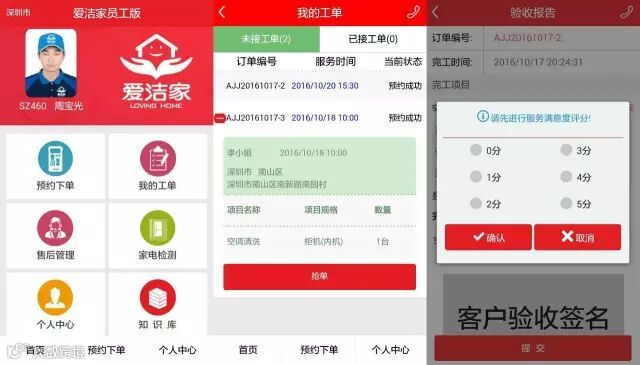 爱洁家工单处理APP系统是爱洁家技服工程师在服务过程中使用的专业工具,可以根据工程师及客户的位置及服务时间进行自动化匹配,工程师可以最快的接收订单并及时上门为客户服务。爱洁家将为客户服务的过程精细化的分解成接单、上门、到达、验机、客户验机确认、施工、客户验收及评分、收款等标准化步骤进行处理,并通过APP及时上传反馈到爱洁家总部营运系统,并针对服务过程中的故障及服务结果,实时影像及图片上传,后台营运及售后团队第一时间响应并及时处理。