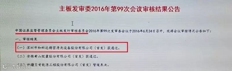 中国证券监督管理委员会主板发行审核委员会2016年第99次审核会议于2016年6月24日召开,据审核结果显示:深圳市和科达精密清洗设备股份有限公司(首发)获通过。