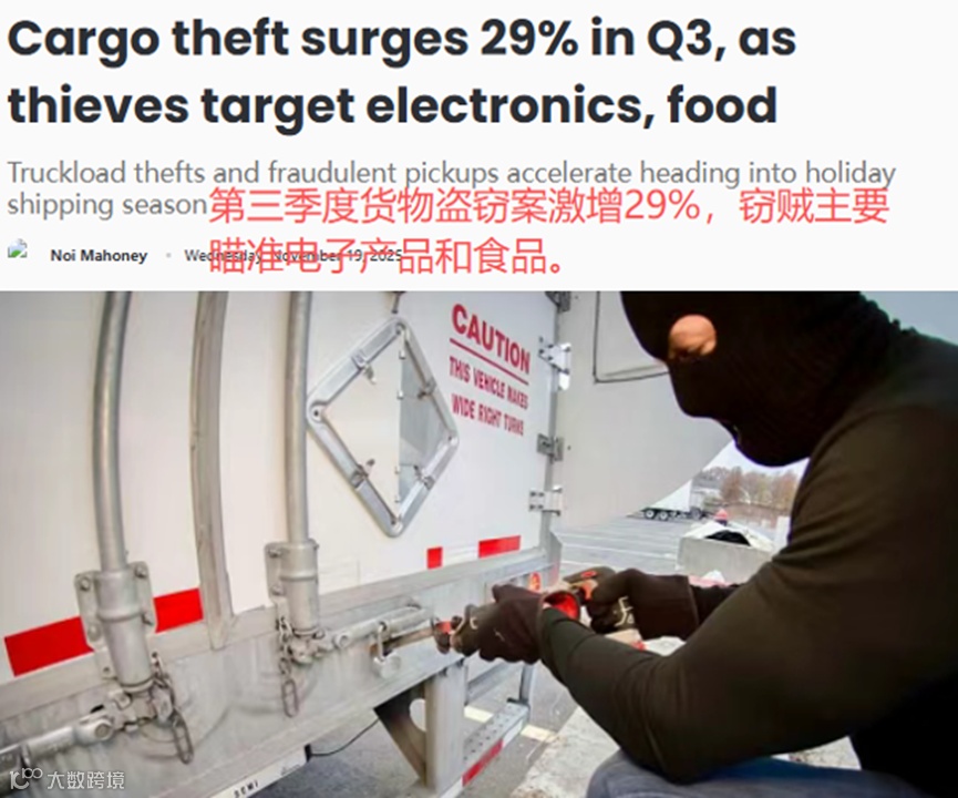 Overhaul发布的《2025年第三季度货物盗窃报告》就指出,Q3美国货物盗窃案件数量显著上升,共有645次盗窃事件发生,同比增长29%,其中电子产品、食品饮料是最常被盗窃的产品。