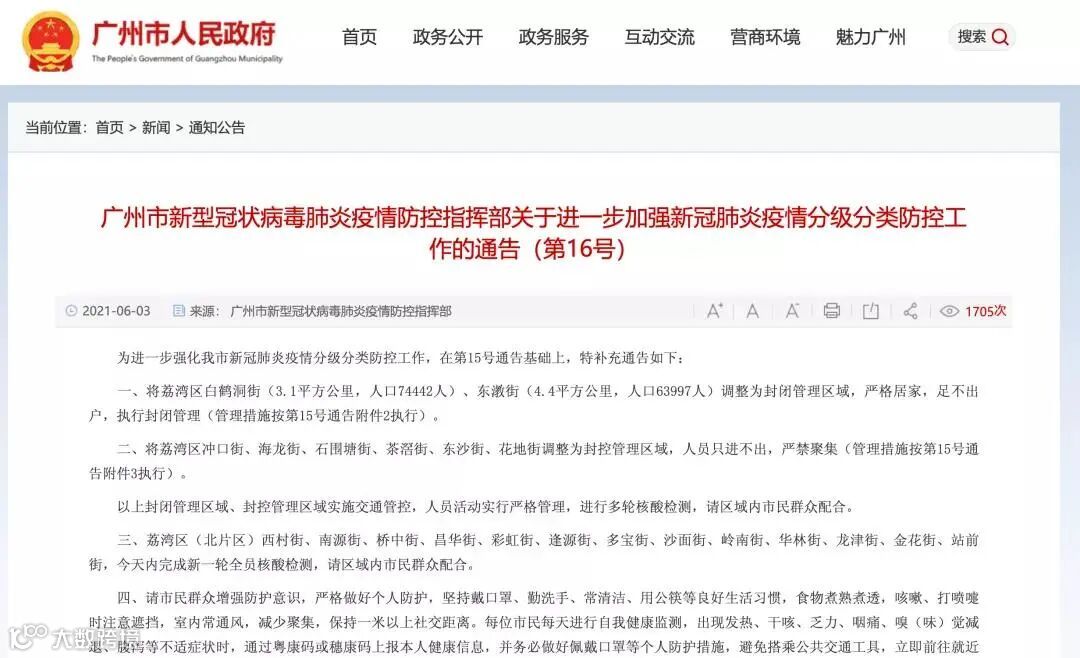 今天(3日)下午4时许,广州市新型冠状病毒肺炎疫情防控指挥部发布《广州市新型冠状病毒肺炎疫情防控指挥部关于进一步加强新冠肺炎疫情分级分类防控工作的通告(第16号)》。