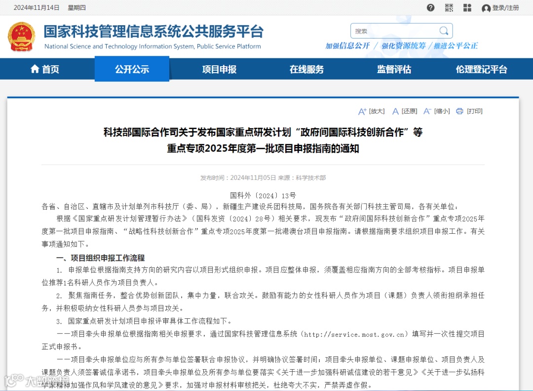 为积极加强与各国的科技创新合作,共同推动解决政府间关注的重大议题和共同挑战,国家科技部国际合作司于2024年11月5日发布了国家重点研发计划“政府间国际创新合作”重点专项2025年度第一批项目申报指南,开展组织相关项目申报工作。