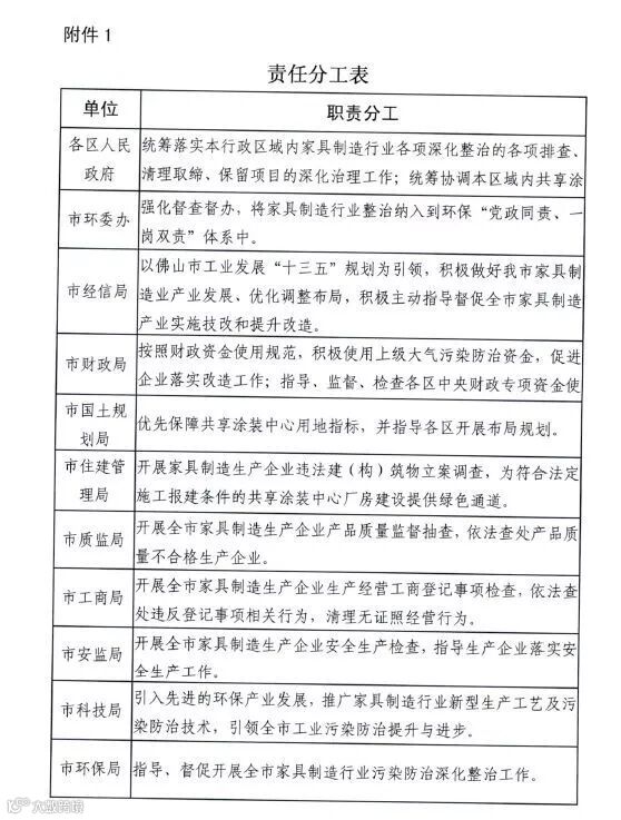 (一)压实责任。各区政府负责具体推进,市经信、财政、国土、住建、环保、质监、工商、安监、科技等各只能部门(附件1)要加强合作,协同共治,通过商事登记、产业规划,用地规划等方面控制家具行业粗放发展,按照各自职责做好家具制造行业深化整治的相关工作。各区要明确年度工作目标与整治任务,将整治工作任务细化到镇街,落实到具体责任人,市环委办将增强督促、指导工作,对工作进度开展督查,将完成情况纳入到环保“当政同责、一岗双责”考核讲评。