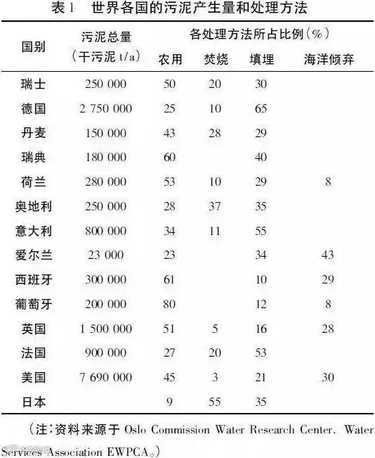 在污泥处置方面,世界各国根据具体情况不同,选择的方法各有侧重。据有关资料,世界各国的污泥产生量和处理方法统计见表1。