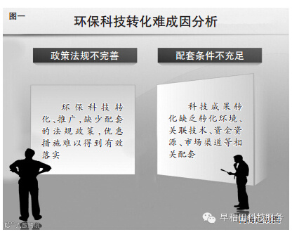 业内人士指出,现阶段环保科技转化存在着很多难题(成因分析如图一所示)。