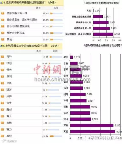 另外,谈及购买哪家房企的精装房出现过问题,在万科、绿地、恒大、保利等12家房企中,选择万科的网友占比最大,为13.3%,其次是占比均为9.3%的绿地、恒大、保利,选择金地、融创者最少。数字100市场研究公司调查数据也显示,较多网友选择了万科、绿地,选择融创的网友占比最小。