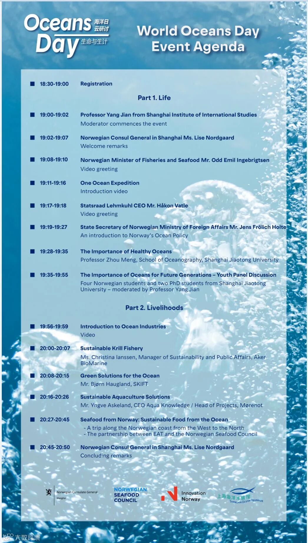 2021年6月8日是第十三个世界海洋日。与2020年相同,挪威驻上海总领事馆在上海水族馆举行了世界海洋日云研讨活动,今年的主题为“生命与生计”。挪威渔业和海产部大臣Odd Emil Ingebrigtsen和国务秘书Jens Frolich Holte通过线上分享挪威的海洋政策。