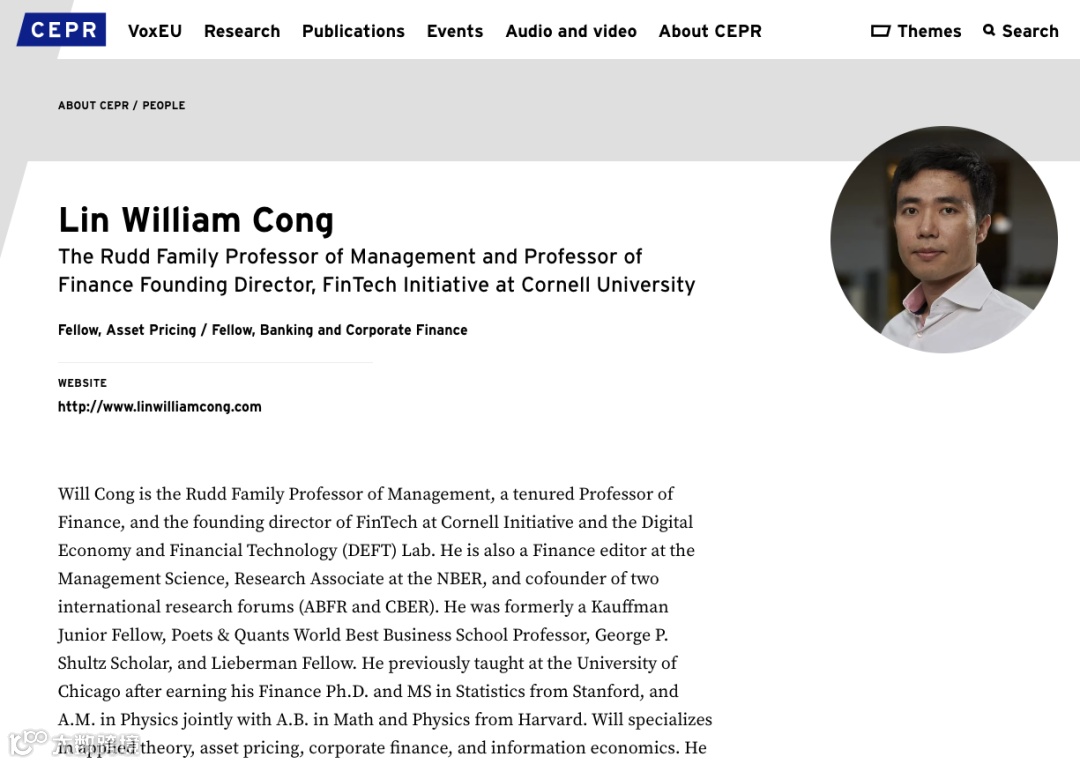 CEPR高度肯定了Lin William Cong教授在金融经济学、资产定价、公司金融、科技创新与金融科技等领域的研究贡献,并表示非常欢迎他加入CEPR,长期参与该国际网络的合作研究、学术交流及政策相关活动。具体介绍信息见