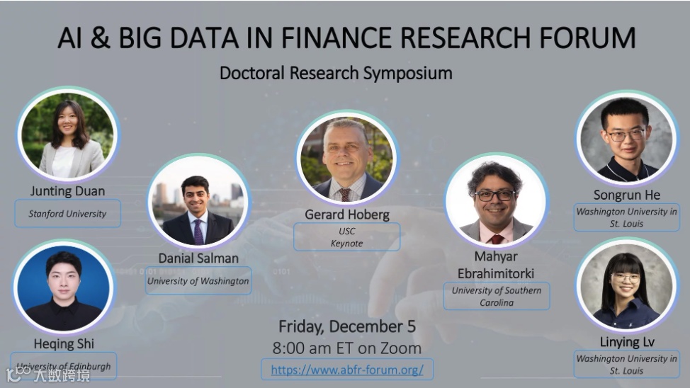由AI & Big Data in Finance Research Forum(ABFR)主办的2025年博士研究研讨会将于2025年12月5日(美国东部时间8:00 AM – 2:00 PM)在线举行。