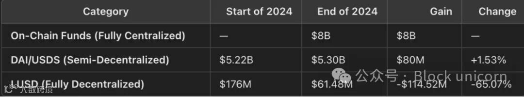 2024 年,中心化链上投资基金累计吸收了 80 亿美元的存款,DAI/USD 的增长率达到 2.3%,而去中心化稳定币如 LUSD 则下降了 65%。