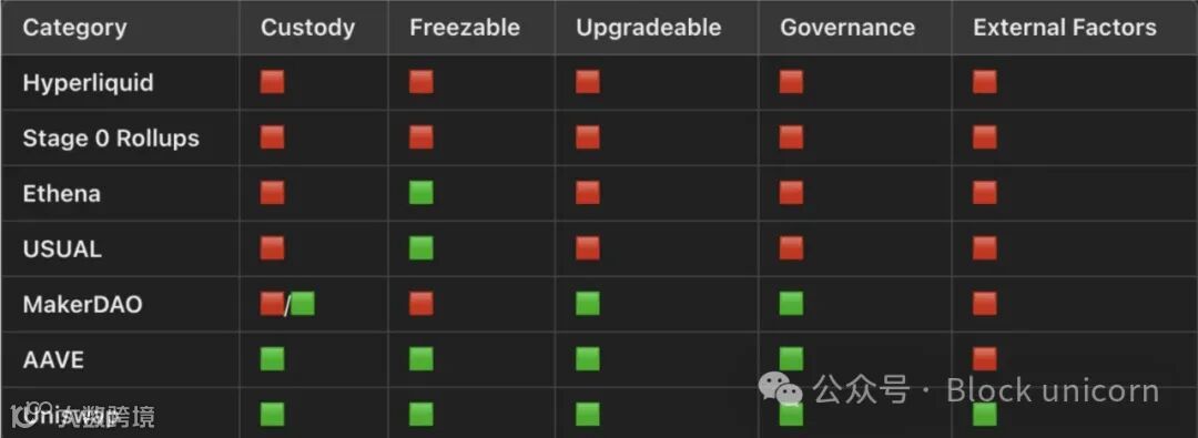 治理层的去中心化:你正在使用的系统是否足够去中心化?区块链参与者是否曾串通一气冻结或阻止某人的资金?是否有多个节点?权益是否分散?验证者是否真正执行验证,还是仅仅盲目签署基金会的指令?他们是否控制了整个系统(例如,0 阶段的 L2)?