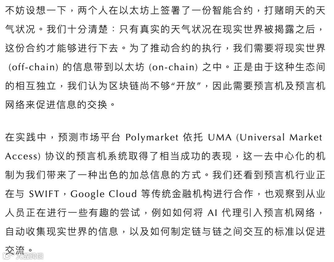 不过,今天我们要讨论的“神谕”是区块链生态中的一种关键基础设施(又译作“预言机”)。从定义上讲,预言机是一种将区块链外部信息写入区块链内部的机制,是连接智能合约与现实世界的桥梁。