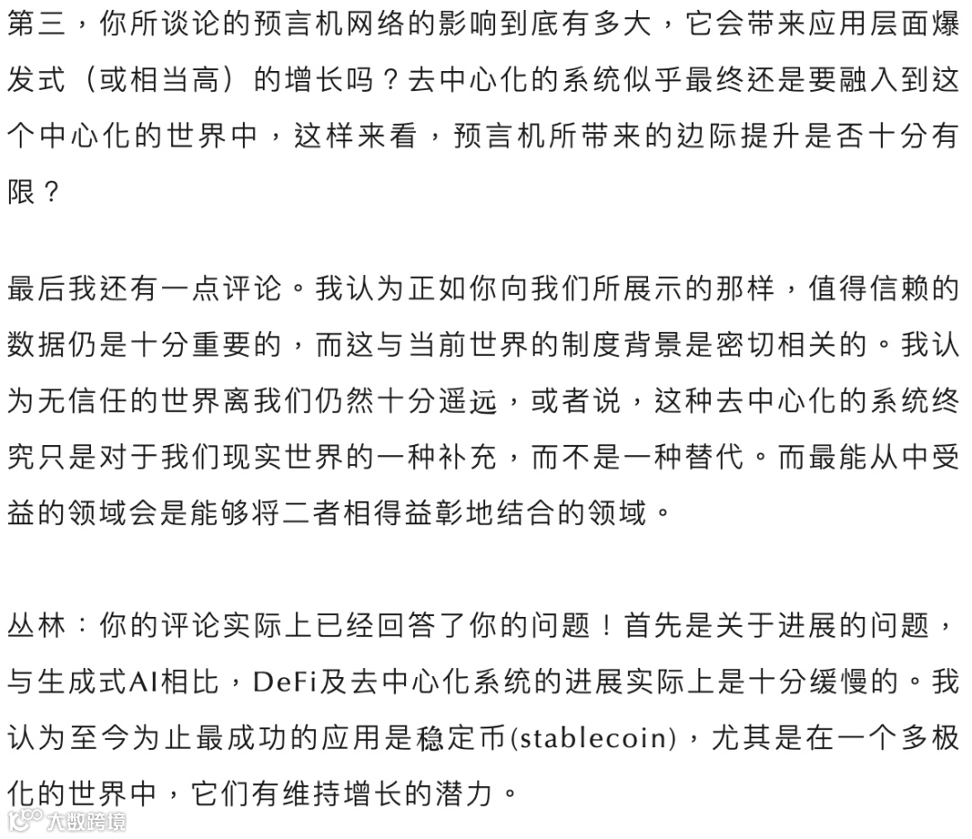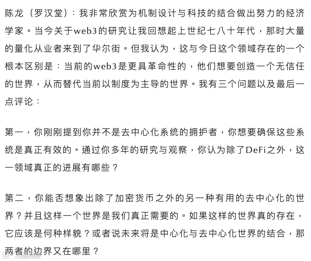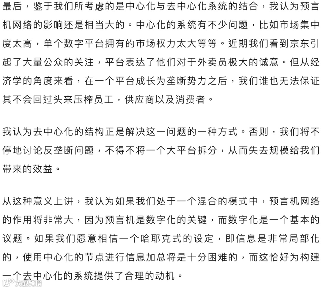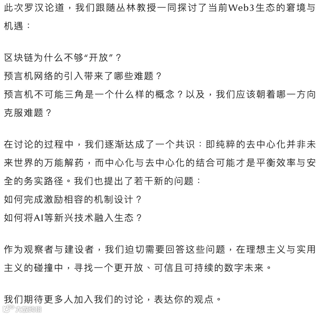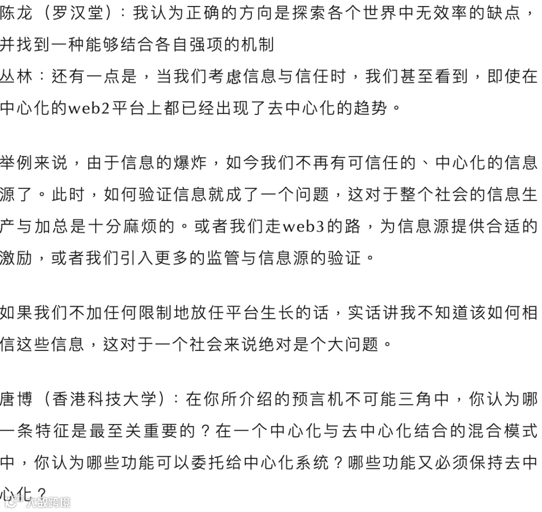 随后,丛林教授分享了在当前技术背景下如何缓解这一难题,并针对去中心化技术的局限,以及中心化与去中心化生态的结合进行了探讨。