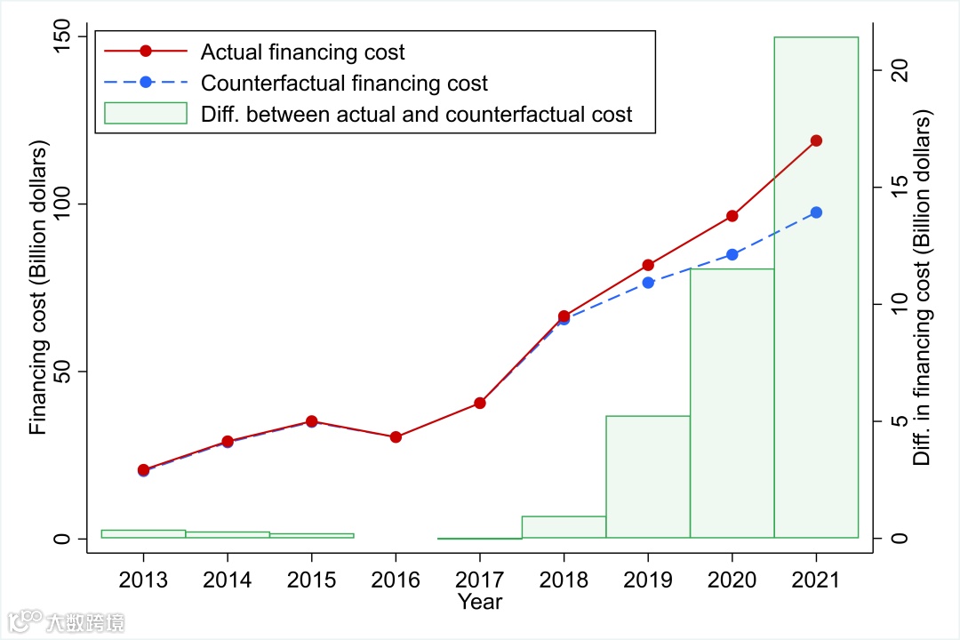 总结来看,在公共部门施行GSA推动生物多样性保护投入的过程中,市场化资金主要关注转型成本所衍生出的金融风险。我们发现在现阶段投资者确实定价了这些潜在风险,提高了公共融资成本,加大了政府财务负担,不利于生态和财政双重可持续发展的有效推进。文章的最后部分简要估计了额外融资成本的体量,并与中国对全球生物多样性融资缺口的潜在承担规模比较,发现上述金融摩擦带来的效率损失具有经济显著性。