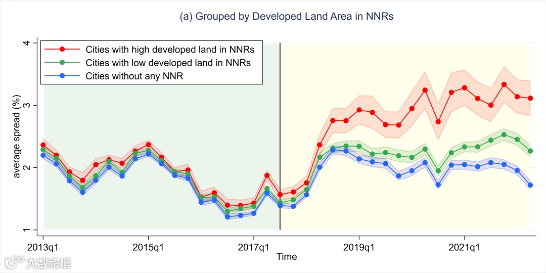 第一,通过整合保护区地理信息和卫星遥感数据,文章发现在GSA实施前NNR内人类经济活动程度越高,投资者预期当地GSA整改负担越重,对应城投债利差在随后的上升程度也越大;