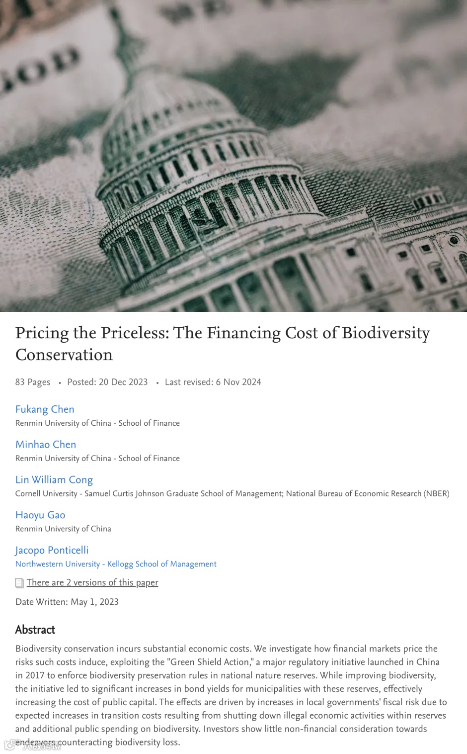 生物多样性保护相关活动具有经济外部性高、项目估值难等特点,使得资源有限的公共部门往往需要承担较多投入,而大规模、分散化的市场化资金有待进一步激励。生物多样性保护如何影响资本市场的融资成本,以及市场投资者如何权衡生物多样性保护下的长期和短期价值冲突,目前文献中缺乏足够的研究。对此,中国人民大学的陈福康、陈珉昊、高昊宇,康奈尔大学的叢林(Lin William Cong),与美国西北大学的Jacopo Ponticelli以中国自2017年以来开展“绿盾”自然保护地专项监督检查工作(以下简称“绿盾”行动)为切入点,整合地理信息、政府公告、报纸新闻、物种观察等多元另类数据集,讨论资本市场如何定价政府主导的生物多样性保护转型和资金投入。