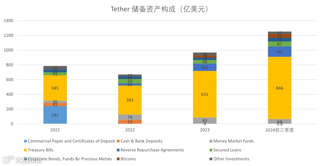 自2021年至2024年前三季度,Tether储备资产分别为787亿美元、670亿美元、970亿美元、1255亿美元,历年美国国债占比最大。Tether的稳定币发行公司现在持有超过1050亿美元的现金和现金等价物,其中有1025亿美元的直接和间接美国国债持有量,如果将其归类为一个国家,它将位居全球前18位,高于德国、澳大利亚和阿联酋。