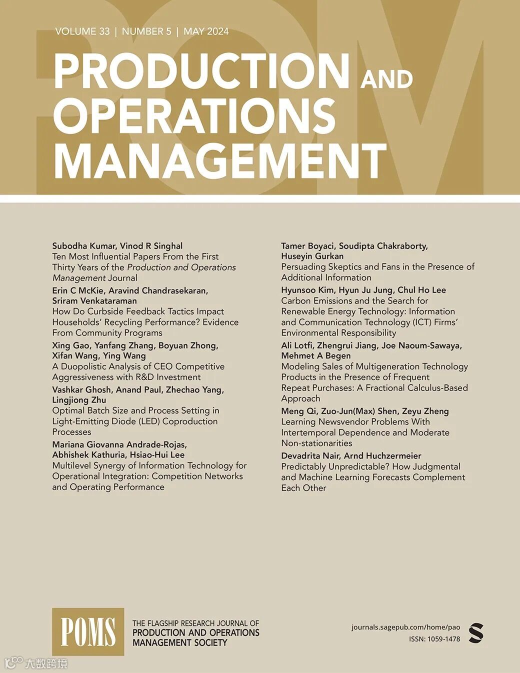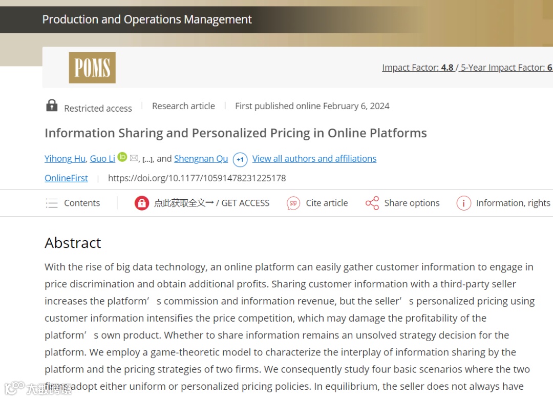 同济大学管理科学与工程系老师胡一竑作为第一作者,与在读博士研究生渠胜男等人的合作论文“Information Sharing and Personalized Pricing in Online Platforms”(在线平台上的信息共享和个性化定价)被运营管理类国际顶级期刊《Production and Operations Management》录用并在线发表。
