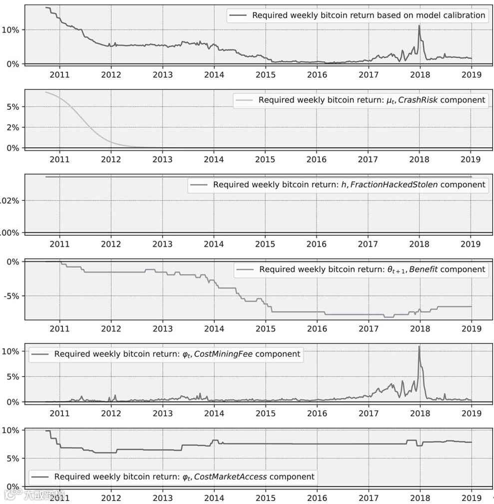 图7 比特币所需回报的组成部分(该图显示了比特币所需回报在所有模型变量中的分解情况。分解基于线性化模型。首图绘制了所需总回报,其余图将其分解为五个组成部分)