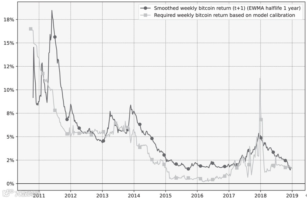 图6 模型拟合情况(该图绘制了经过平滑处理的比特币实际收益率,并将其与校准模型所隐含的所需收益率重叠)