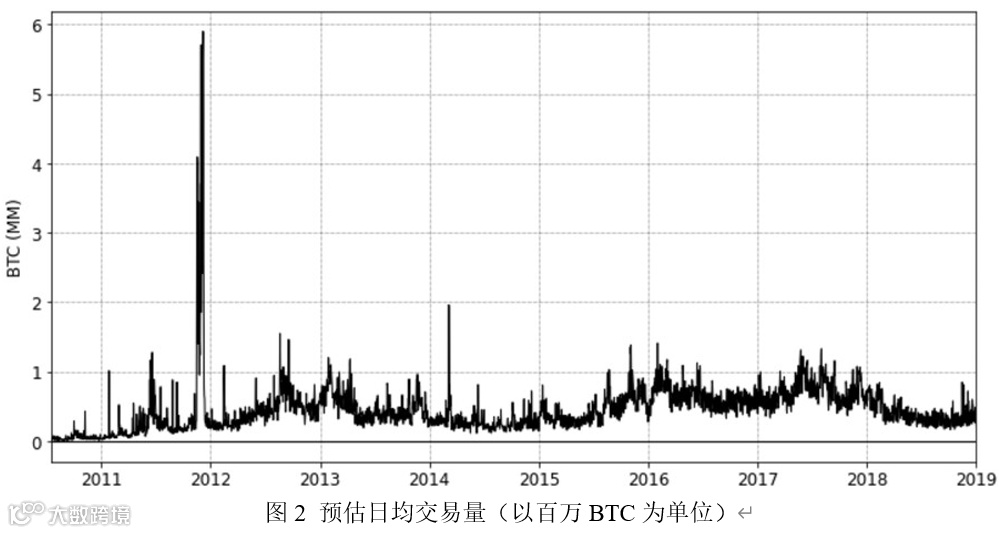 其次,作者还收集了比特币交易量数据,包括总交易量和排除“自我交易(属于同一参与者的地址之间的转账)”后的净交易量。图2展示了估算出来的比特币日交易量的时间序列图。