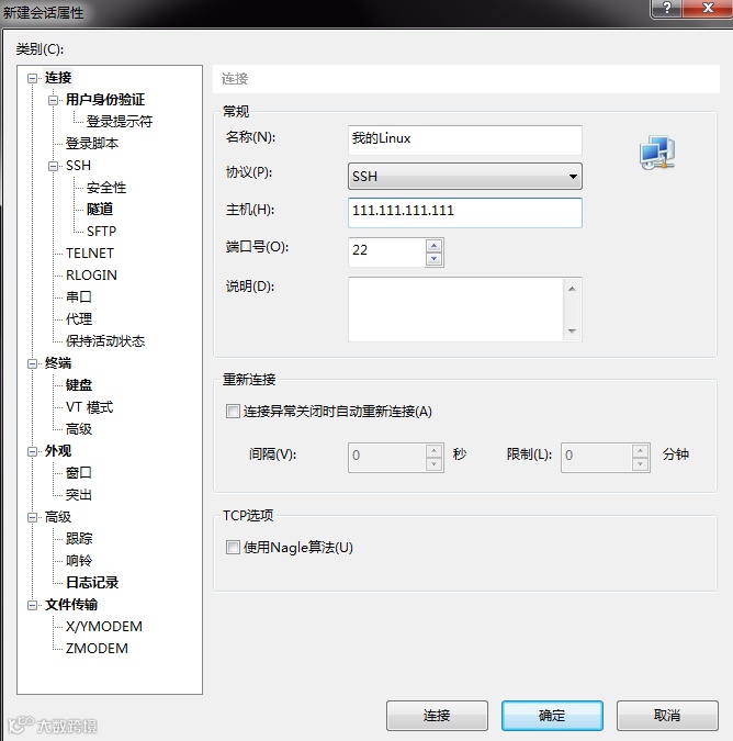 输入名称(随便输),协议选择SSH(SSH协议是专为远程登录会话和其他网络服务提供安全性的协议),主机是你连接服务器的IP地址或域名,端口号为22(SSH默认端口号)